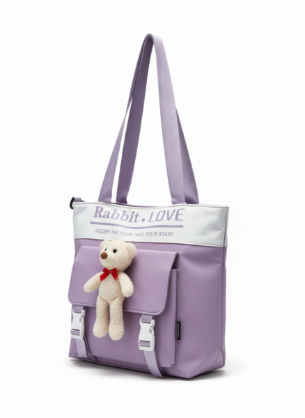 SRZ Cute Korean Style Tote Bag, Multi-functional One Shoulder Cross body Tuition Bag, Study Bag With Small Teddy Bear As a Prop Detachable Strap