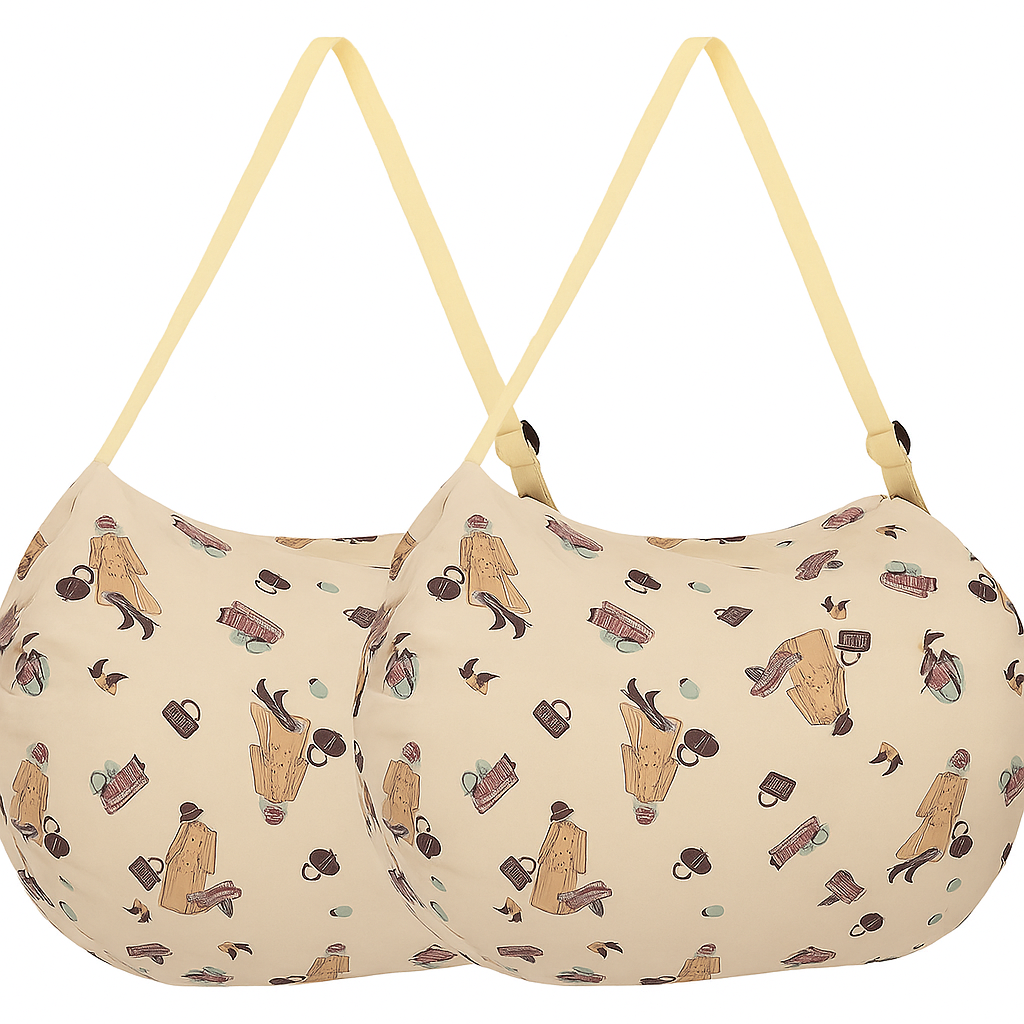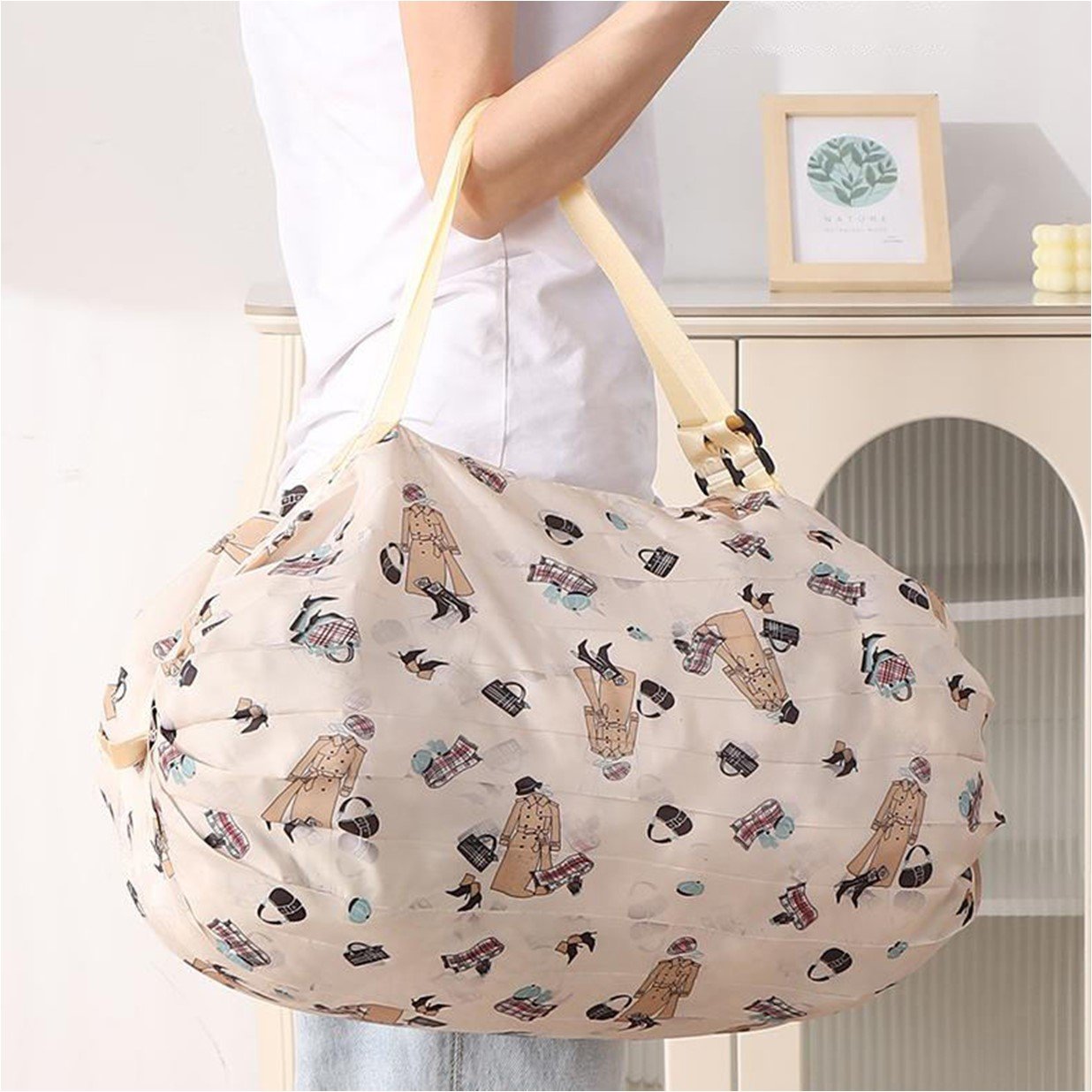 SRZ Foldable Shopping Bag with Zipper Picnic Snacks bag Shoulder Hand Bag Grocery bag Picnic Bag Nylon Waterproof (Cream Design – PACK OF 2)