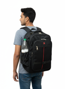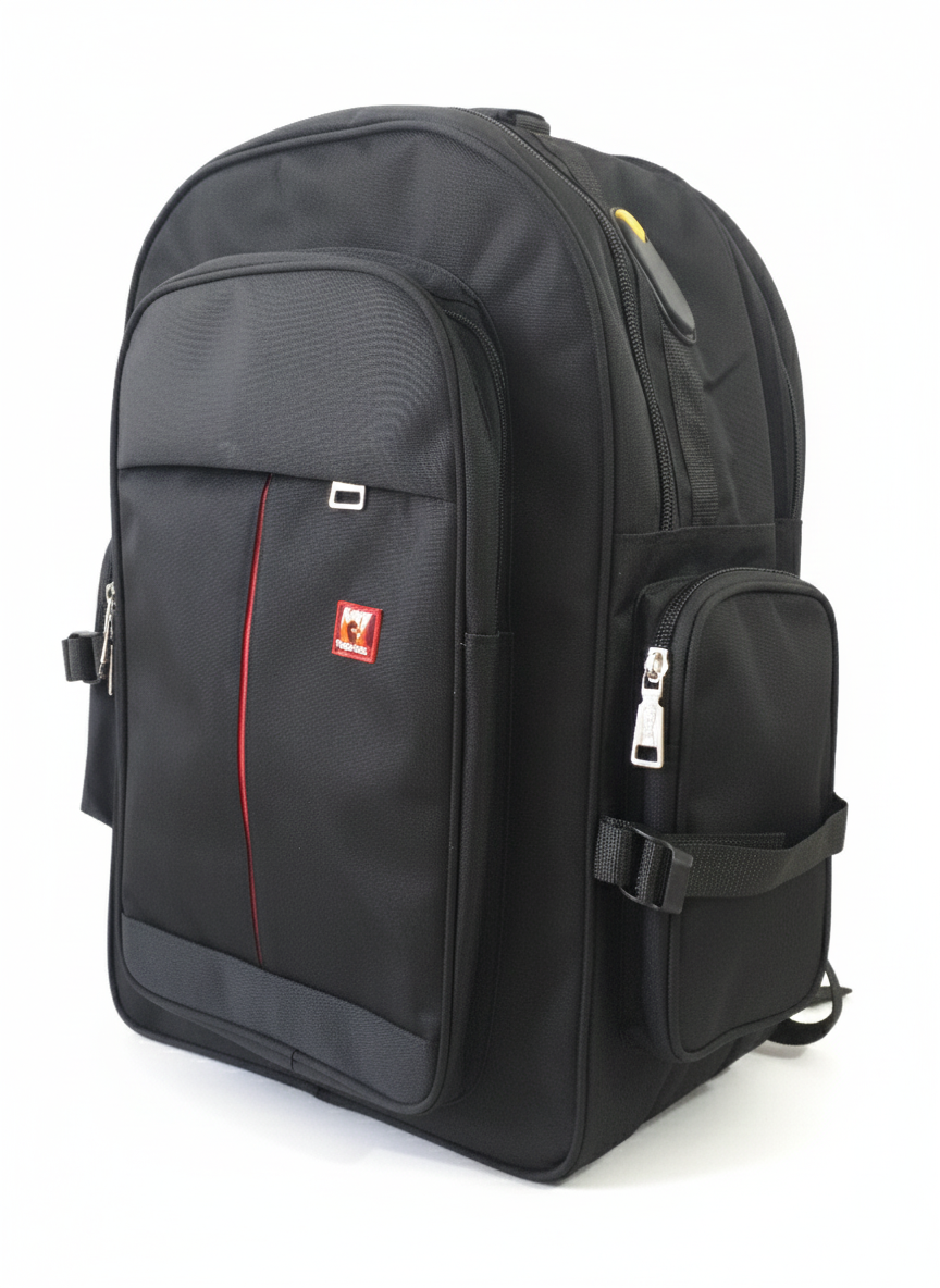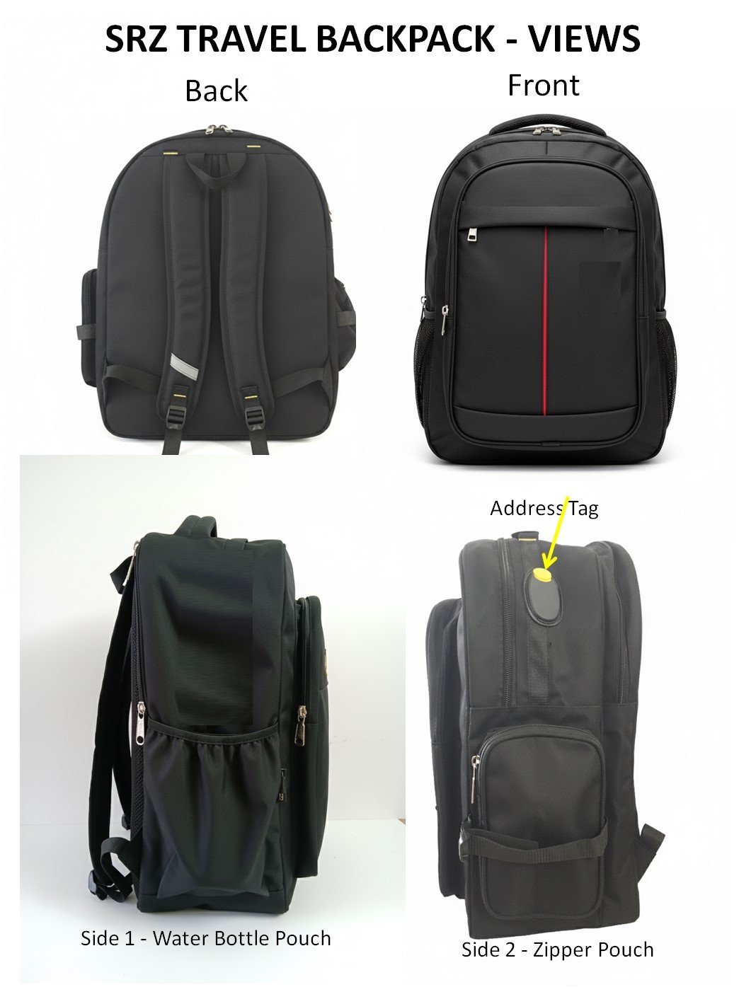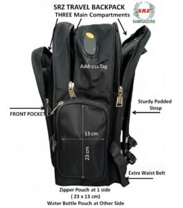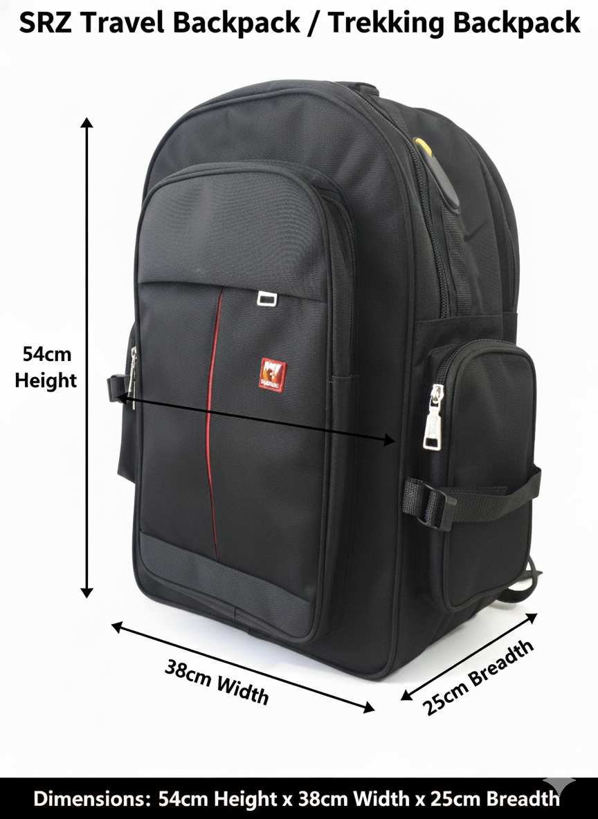 - Introducing the SRZ Travel Backpack, a versatile companion for all your journeys PROUDLY MADE IN INDIA. This spacious backpack features three main compartments and one Front Pocket for organised storage, measuring 54cm in height, 38cm in width, and 25cm in breadth. The thoughtful design includes convenient side pockets – a water bottle pouch on one side and a zipper pouch (23cm x 13cm) on the other, perfect for quick-access items. The backpack comes with sturdy padded shoulder straps for comfortable carrying, while the extra waist belt provides additional support during long treks. A practical address tag is included for easy identification. The front pocket offers easy access to frequently needed items, and the hardboard base with fiber strip ensures durability and maintains the bag’s shape. The classic black colour and robust construction make it suitable for various uses, from daily commuting to weekend adventures / Trekking. The multiple compartments help keep your belongings systematically organised, making it an ideal choice for travelers, students, and professionals alike.